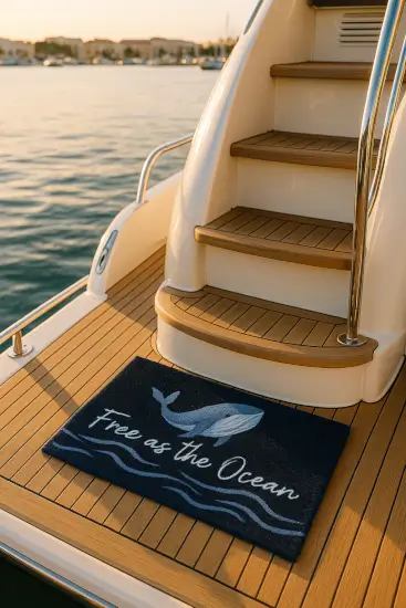 Breng de vrijheid van de zee aan boord of bij je voordeur met deze blauwe deurmat met de tekst “Free as the ocean” en een stijlvolle walvisprint. Perfect voor boten, strandhuizen of gewoon voor liefhebbers van het maritieme leven. De deurmat is niet alleen decoratief, maar ook praktisch: je kunt hem gewoon wassen in de wasmachine op 40 graden, waardoor hij altijd fris en schoon blijft. Gemaakt van hoogwaardige materialen en voorzien van een stevige afwerking, ideaal voor intensief gebruik. Voeg een vleugje oceaangevoel toe aan je entree met deze duurzame en wasbare maritieme deurmat.